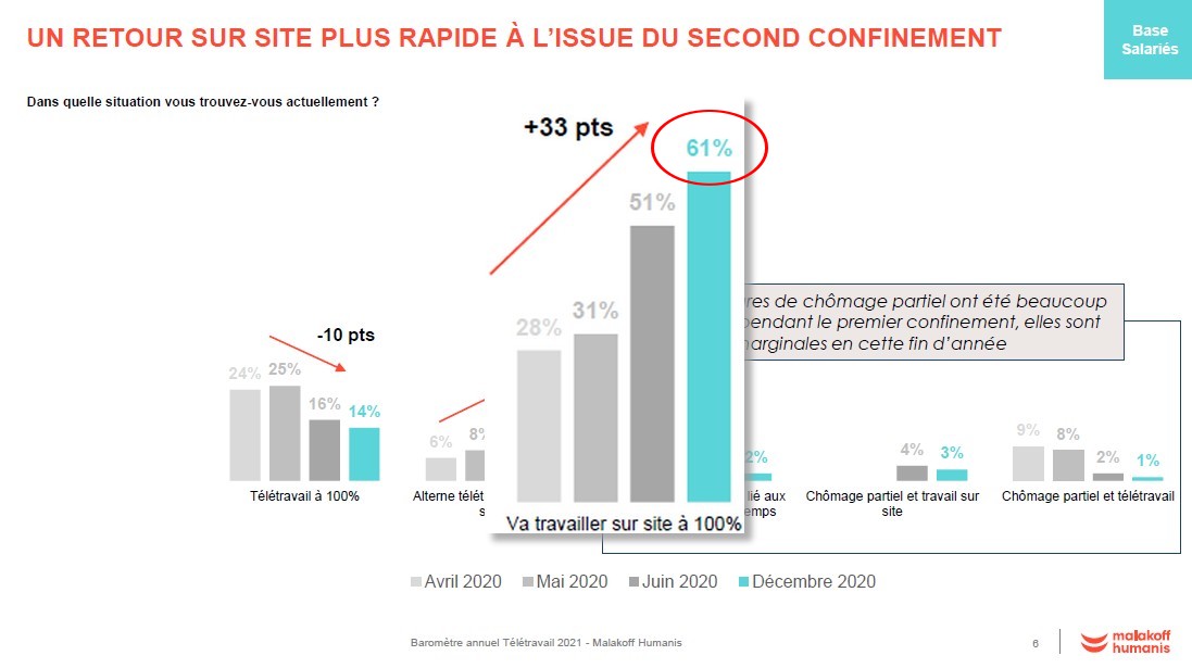 Selon une étude menée par Malakoff Humanis en 2020, la proportion de chefs d’entreprise favorables au télétravail est plutôt majoritaire. Mais là où ça coince, ce n’est pas au niveau de la direction mais bel et bien au niveau du management intermédiaire puisque la moitié d'entre eux déclare maintenant avoir un avis défavorable.